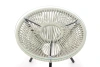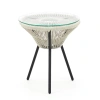 Форма и материалы стола отсылают к эстетике одноимённого кресла и дивана: визуально лёгкий, но устойчивый, он идеально вписывается в коллекцию мебели «Акапулько». Металлическое основание, выполненное в виде лучеобразных спиц и ротанга, перекликается с узнаваемыми линиями кресла, создавая целостный образ. Благодаря круглой стеклянной столешнице стол выглядит невесомо и визуально не утяжеляет пространство.