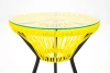 Форма и материалы стола отсылают к эстетике одноимённого кресла и дивана: визуально лёгкий, но устойчивый, он идеально вписывается в коллекцию мебели «Акапулько». Металлическое основание, выполненное в виде лучеобразных спиц и ротанга, перекликается с узнаваемыми линиями кресла, создавая целостный образ. Благодаря круглой стеклянной столешнице стол выглядит невесомо и визуально не утяжеляет пространство.