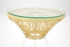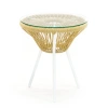 Форма и материалы стола отсылают к эстетике одноимённого кресла и дивана: визуально лёгкий, но устойчивый, он идеально вписывается в коллекцию мебели «Акапулько». Металлическое основание, выполненное в виде лучеобразных спиц и ротанга, перекликается с узнаваемыми линиями кресла, создавая целостный образ. Благодаря круглой стеклянной столешнице стол выглядит невесомо и визуально не утяжеляет пространство.