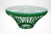 Форма и материалы стола отсылают к эстетике одноимённого кресла и дивана: визуально лёгкий, но устойчивый, он идеально вписывается в коллекцию мебели «Акапулько». Металлическое основание, выполненное в виде лучеобразных спиц и ротанга, перекликается с узнаваемыми линиями кресла, создавая целостный образ. Благодаря круглой стеклянной столешнице стол выглядит невесомо и визуально не утяжеляет пространство.