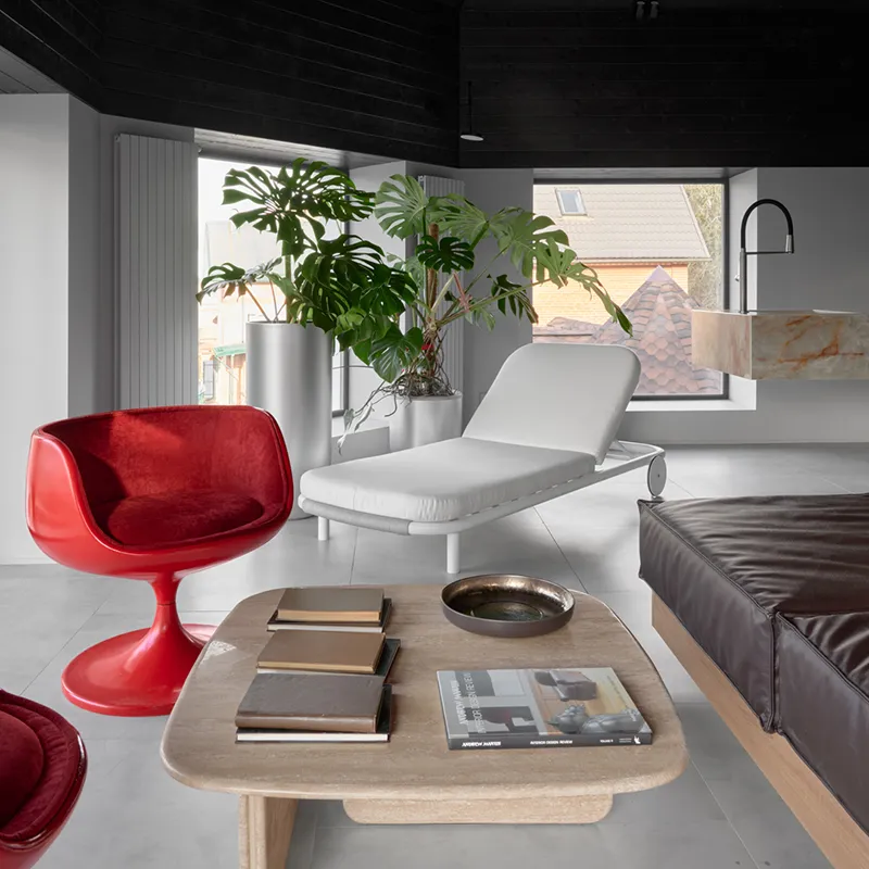 В обновлённой мансарде героев программы всё основано на минимализме, конструктивизме и деконструктивизме. В гостиной царить левитирующая мебель и неправильные формы, но основной акцент сделан на потолке. Специально для Валентины Константиновны – главной героини программы – поставим белый шезлонг «Нордик», чтобы она могла отдохнуть в компании своих любимых цветов.