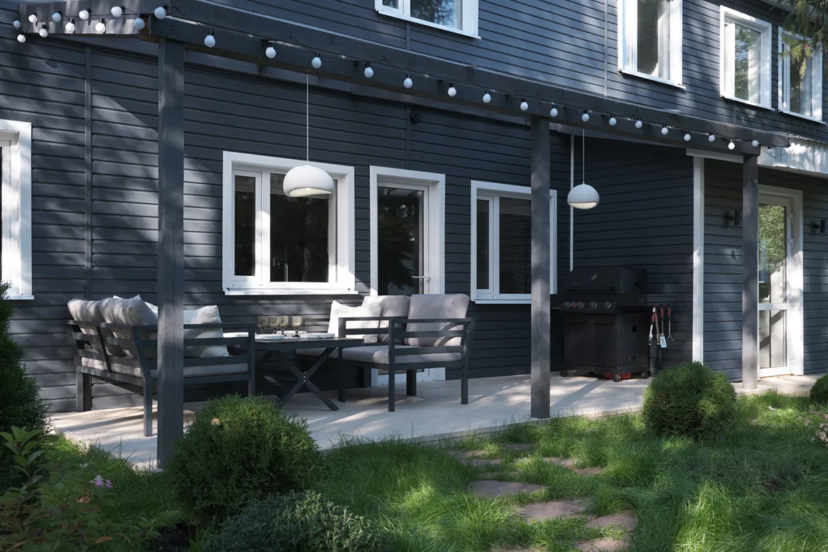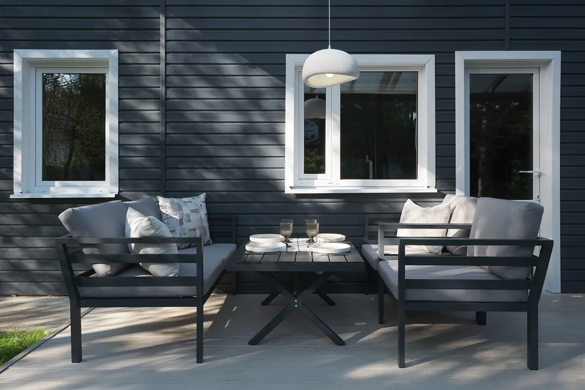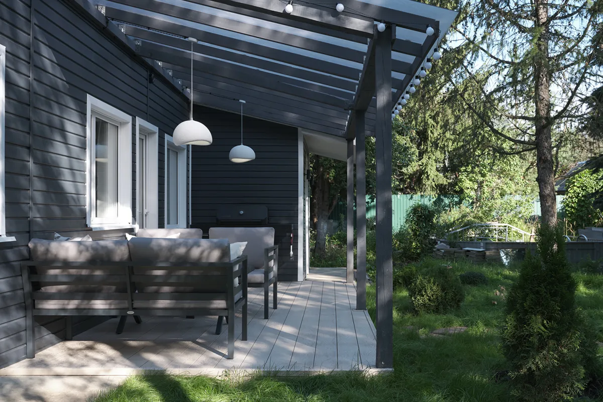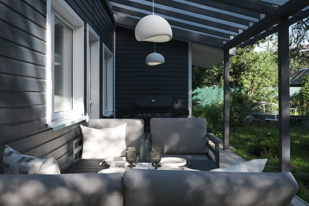 В проекте большое внимание уделили организации уличной зоны, поэтому предусмотрели зону барбекю с нашей уличной мебелью из коллекции «Велтон» – кресла «Велтон» и диван «Велтон» с серыми подушками из олефина, а также стол «Велтон» 130×80 см с чёрной столешницей из ДПК – и газовым обогревателем. Так что веранда стала органичным продолжением обновлённого пространства гостиной.