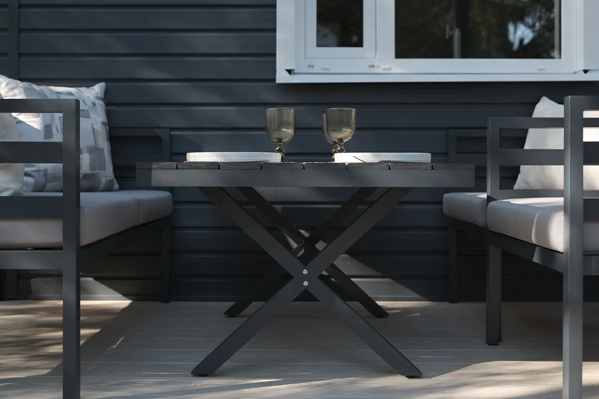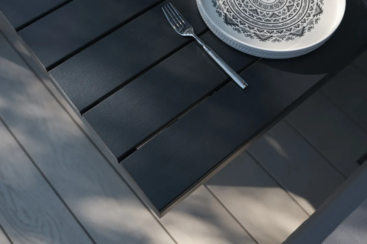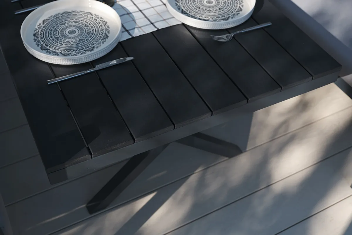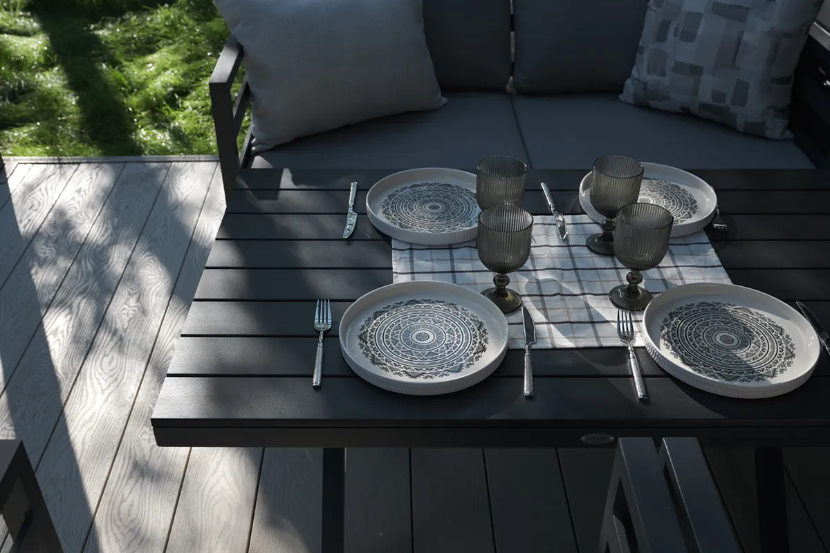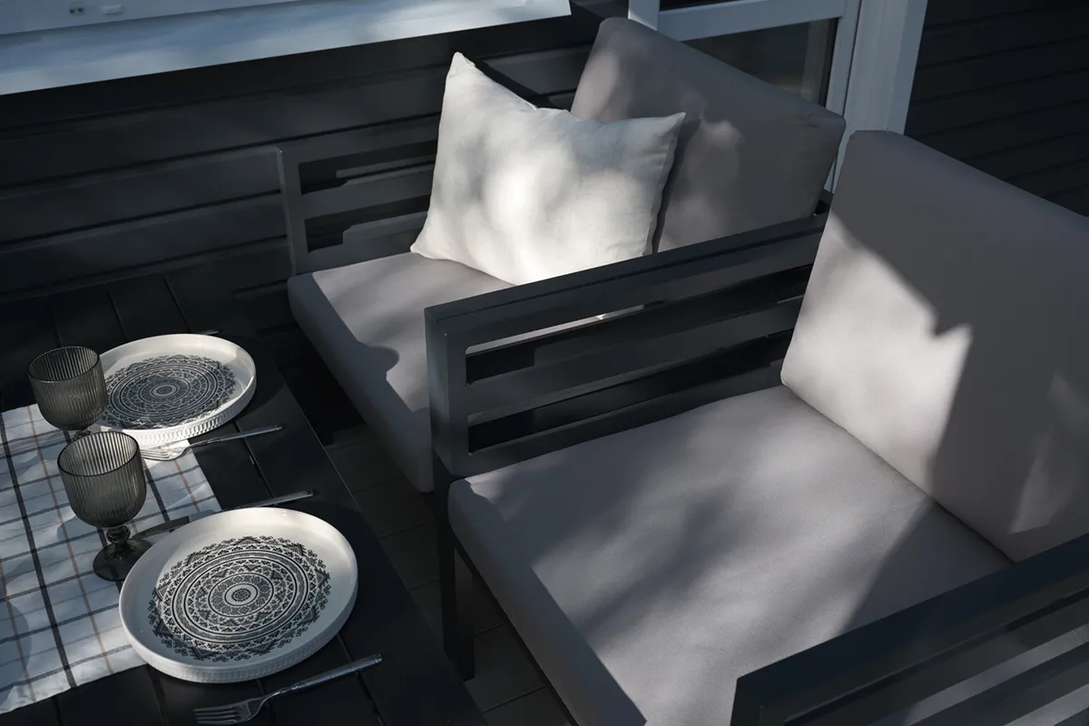 В проекте большое внимание уделили организации уличной зоны, поэтому предусмотрели зону барбекю с нашей уличной мебелью из коллекции «Велтон» – кресла «Велтон» и диван «Велтон» с серыми подушками из олефина, а также стол «Велтон» 130×80 см с чёрной столешницей из ДПК – и газовым обогревателем. Так что веранда стала органичным продолжением обновлённого пространства гостиной.